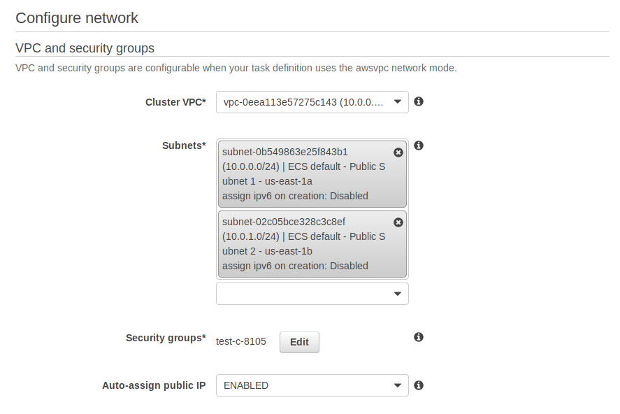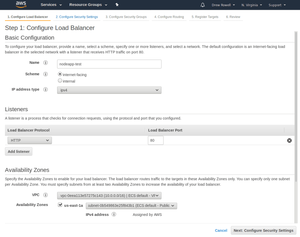 Call it nodeapp-main, change the VPC to ECS default, and add the us-east-1a and us-east-1b availability zones.