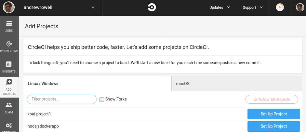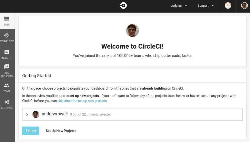 Since you haven’t set up CircleCI with the project yet, you’ll want to click “Set Up New Projects”.