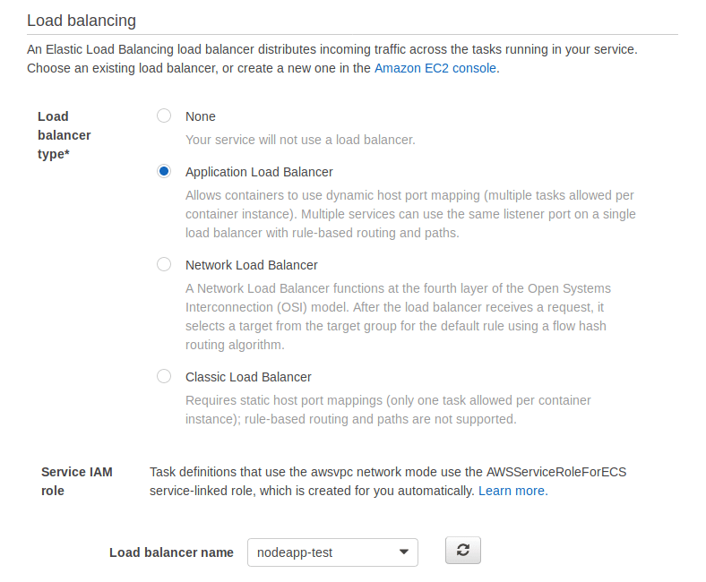 Go back to your browser tab where you were making a new service, and pick the load balancer you just created. You may need to press the refresh button to see it in the list.