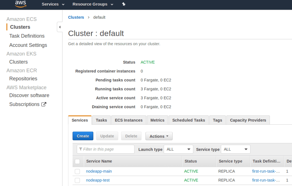 At this point you should have two services. I had to remake one from scratch, so you may not have one called nodeapp-main. If you’re continuing from the previous post, the one you made there is what you should use instead of nodeapp-main for the rest of this tutorial.