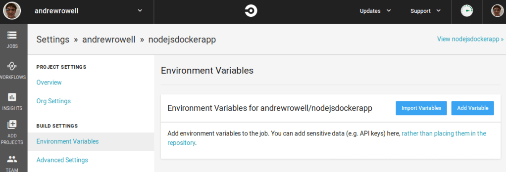 Here we’ll add the sensitive parameters for the build/push step. It is very important that you put them here, and never in your git repo! Although it would be technically possible to hardcode them in the config.yml file for CircleCI, this would mean that your AWS credentials would be visible to anyone with access to the source code!