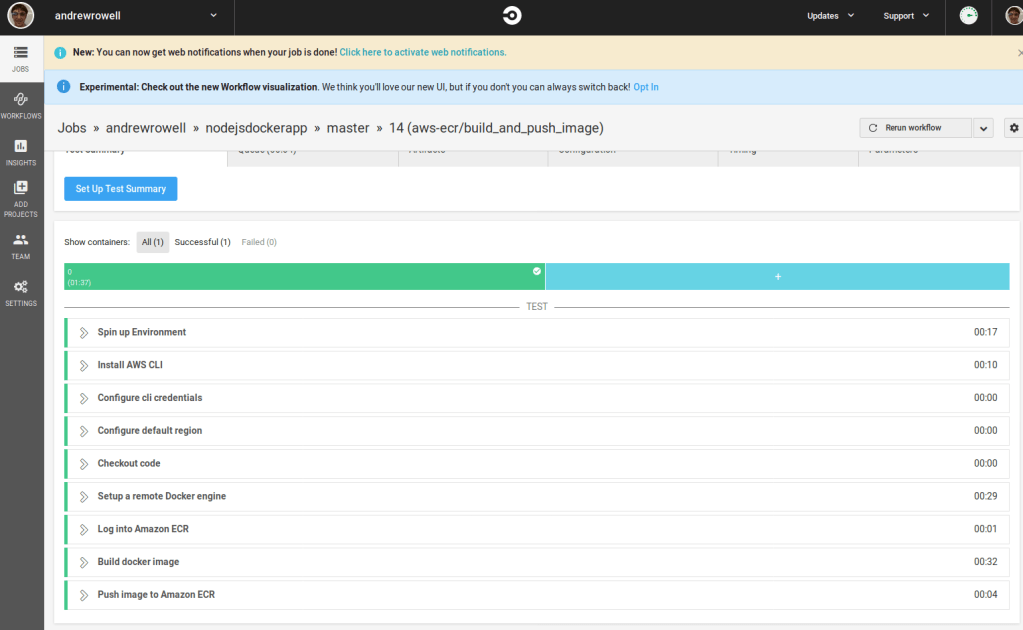 Here we add the aws-ecs/deploy-service-update step. It takes the docker image we built, and deploys it to the nodeapp-test service we created earlier.