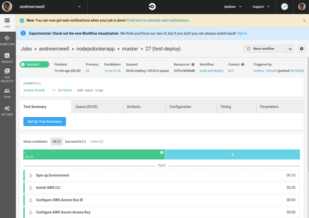 After you make these changes, commit and push them. Then go to CircleCI, and open the latest build.