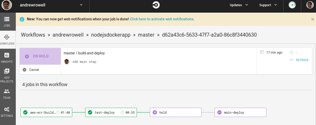 Here you can see that we’ve added two new steps. The first is a hold, to require manual approval to deploy to the main service. The second is the main deployment step. You’ll also notice that we gave the two deployment steps a name field. This is necessary for CircleCI to distinguish the two deploy steps, so the manual hold could be put between them.