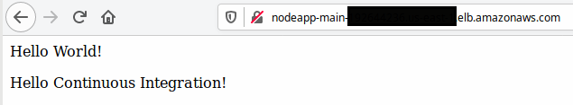 Open up the nodeapp-main load balancer the same way you found the nodeapp-test load balancer earlier, and find its DNS name. After some time, your changes will show up on the main service.