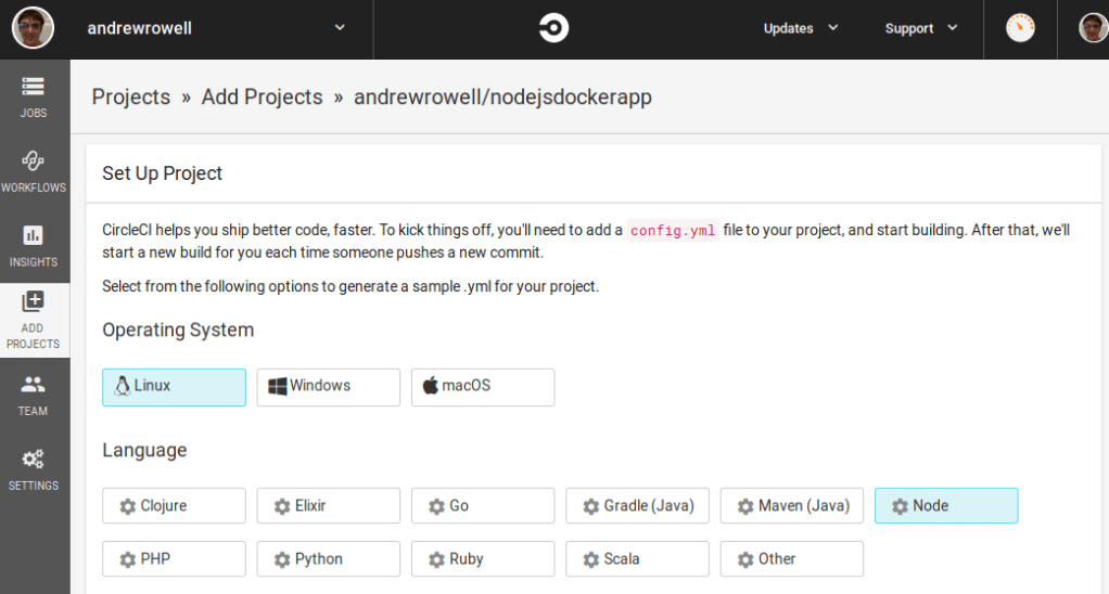 The next screen will have some instructions, but first we want to select Node from the language list.