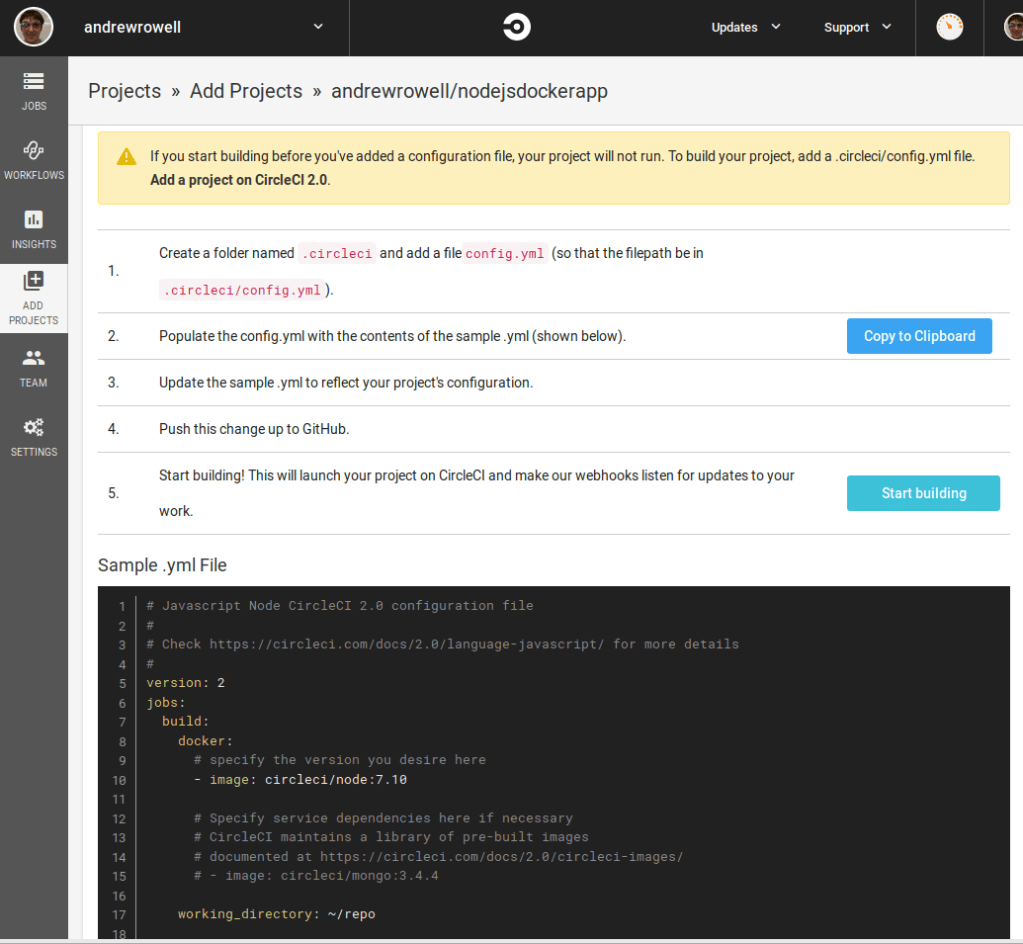 In your app’s source code folder, make a directory called .circleci , and then put the sample file from that page into config.yml . Don’t worry about what’s in it right now.
